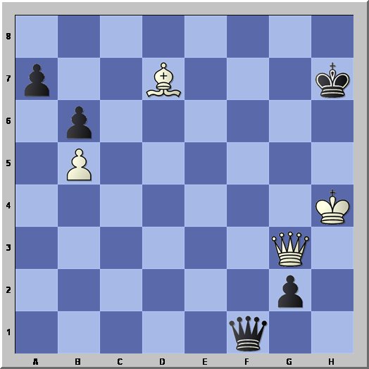 Alekhine conduzia uma simultânea às cegas (!) contra 32 (!!) generais alemães durante a Segunda Guerra Mundial. (Vale a pena abrir este parêntesis para referir que, entre outras coisas, suspeita-se que Alekhine era um simpatizante do regime nazi). Restam apenas 4 jogos, e Alekhine, conduzindo as peças brancas, pede o lance de um general nesta posição.