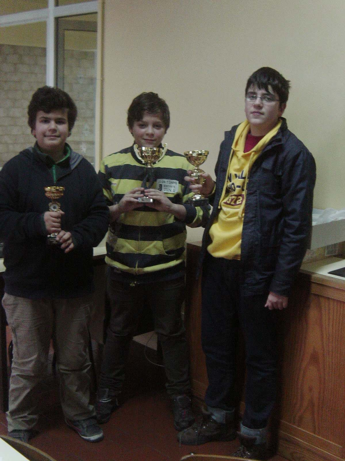 À esquerda, o 3º classificado - João Santos que esteve imparável no Encontro Inter-escolas alcançando o 2º lugar do Torneio, no centro, o vencedor Rúben Ribeiro, que no Inter-escolar perdeu a liderança à 4ª jornada e ficou completamente desconcertado, concluindo a prova alguns «furos» abaixo do seu real valor e à direita, Bruno Ataíde, 2º clssificado, vice-campeão do 7ºD.